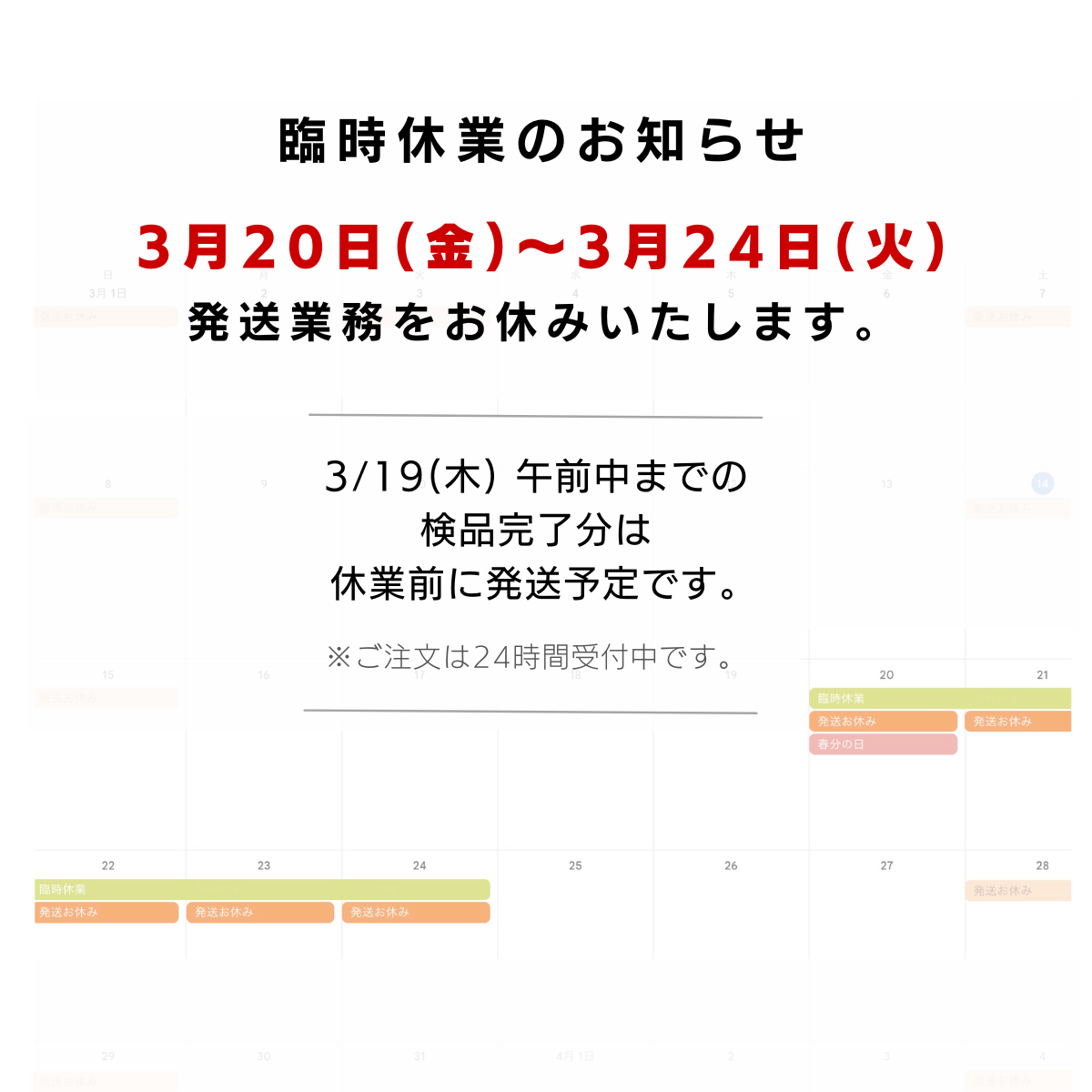 3月20日(金)〜3月24日(火)は臨時休業いたします