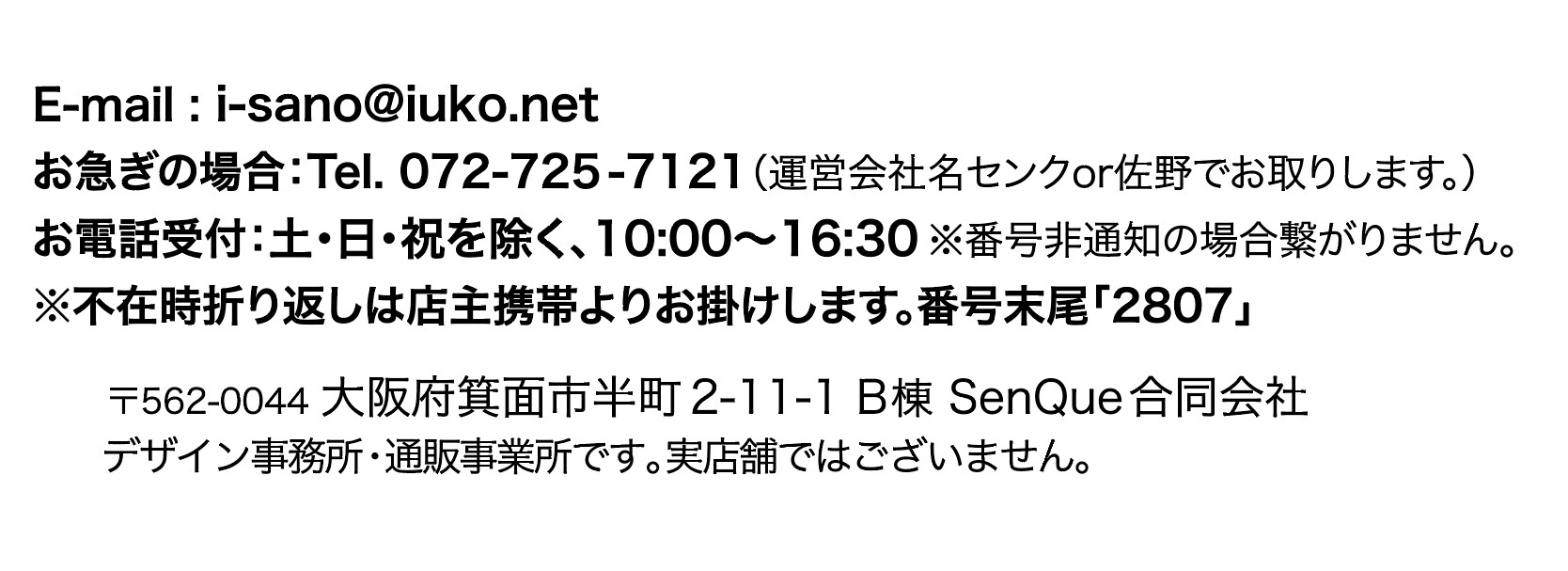 また、携帯・スマホで受信拒否設定をされている方は、当店のメール「i-sano@iuko.net」を受信できるように設定をお願いいたします。